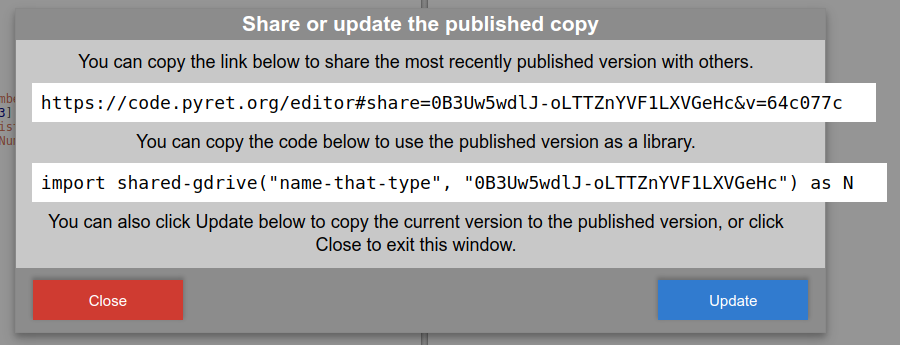 Programmers working through http://code.pyret.org can provide and import code via Google Drive sharing integrated into the development environment.