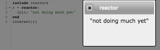 include reactors fun increment(x): x + 1 end r = reactor: init: 0, on-tick: increment, end check: get-value(r) is 0 r2 = react(r, time-tick) get-value(r2) is 1 get-value(r) is 0 end
