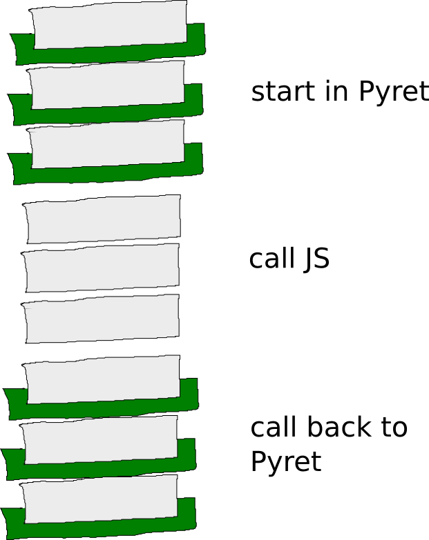 Many library use cases, like data structures and convenience functions, are written as JavaScript code that emulates Pyret function calls. However, if JS code calls back into Pyret code, care is in order. Here’s what the stack looks like if Pyret calls JavaScript that calls Pyret again:
