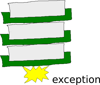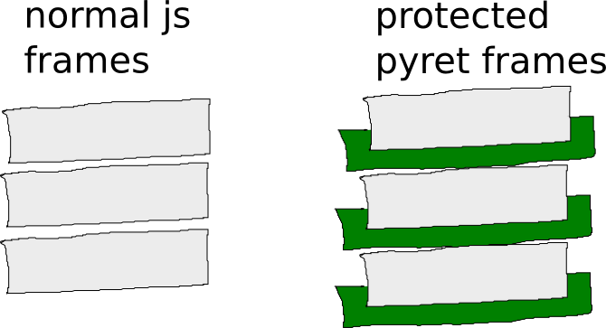 When a Pyret function is compiled, it gets an extra try/catch handler wrapped around it that listens for special Pyret-specific exceptions. That means when it’s running, we can think of the stack frame of the function as having an extra layer around it: