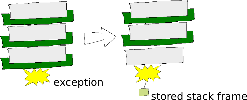 When the exception is encountered by one of the handlers, it attaches enough information to the exception to restart the handler’s frame before allowing the exception to coninue: