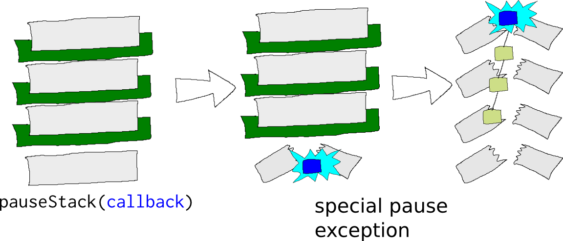 When pauseStack is called, a special pause exception is thrown, that stores the callback passed in as the argument to pauseStack. The pause exception collects Pyret stack frames in the same way as a stack exception, it just keeps track of the callback as well: