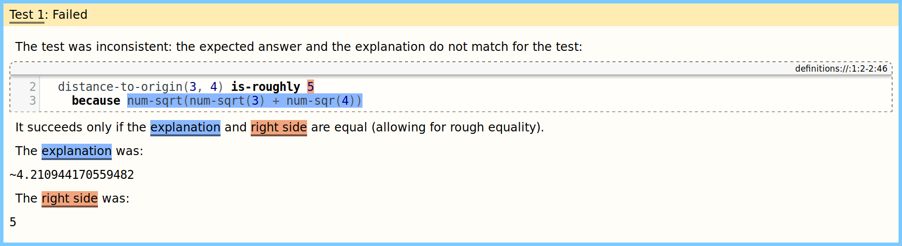 Read this aloud as “The distance to origin of (3, 4) is roughly 5, because the square-root of three squared plus four squared is roughly 5.” The because clause lets us show work, while also connecting the explanation to the original test case.